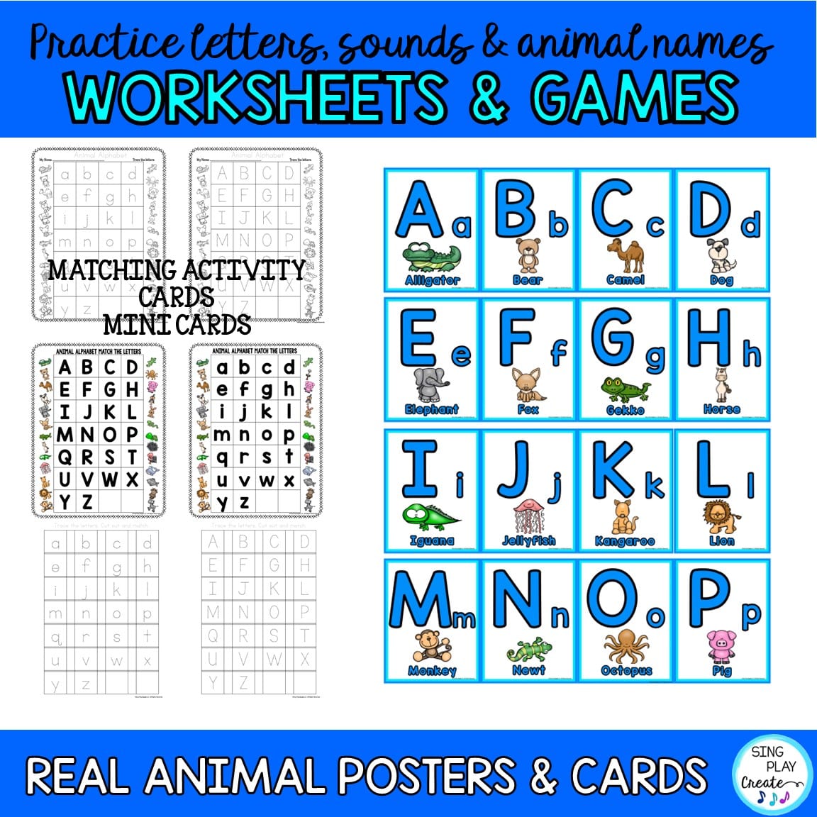 This resource is part of the complete Animal Alphabet Learning Bundle with posters, cards, writing and matching activities as well as twelve games and activities using these materials.