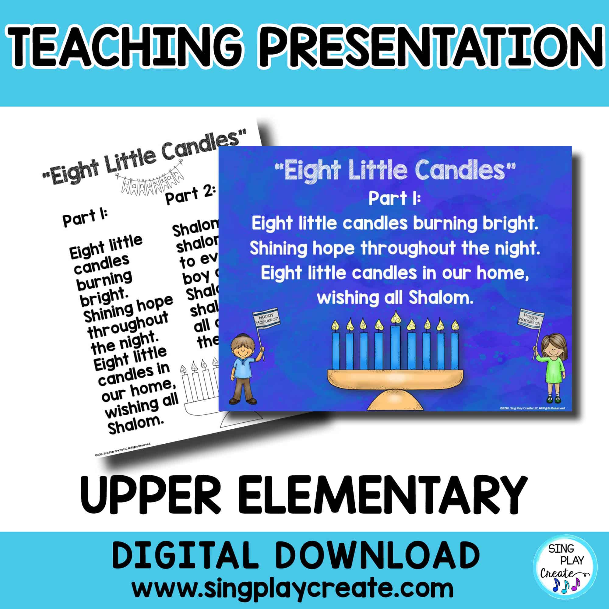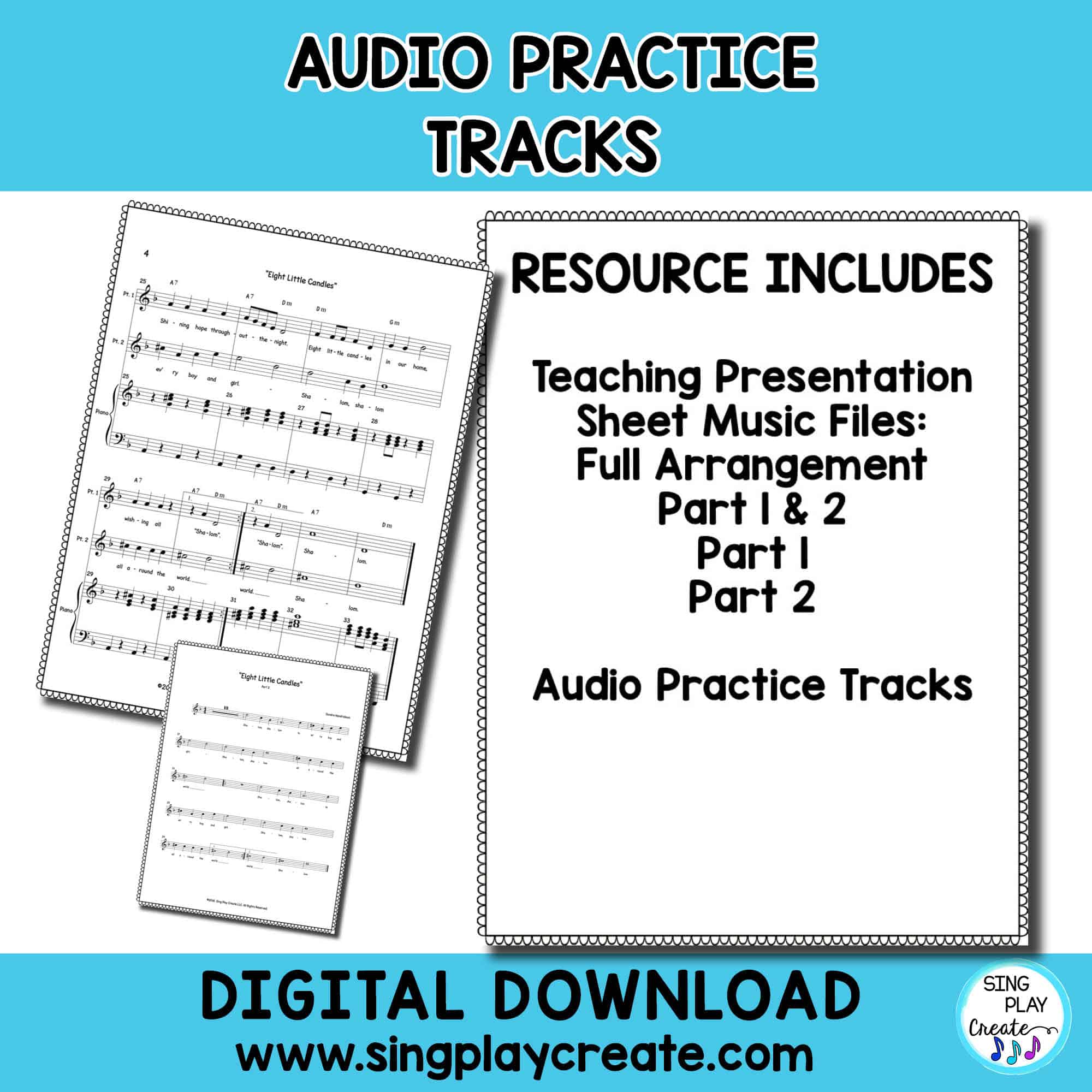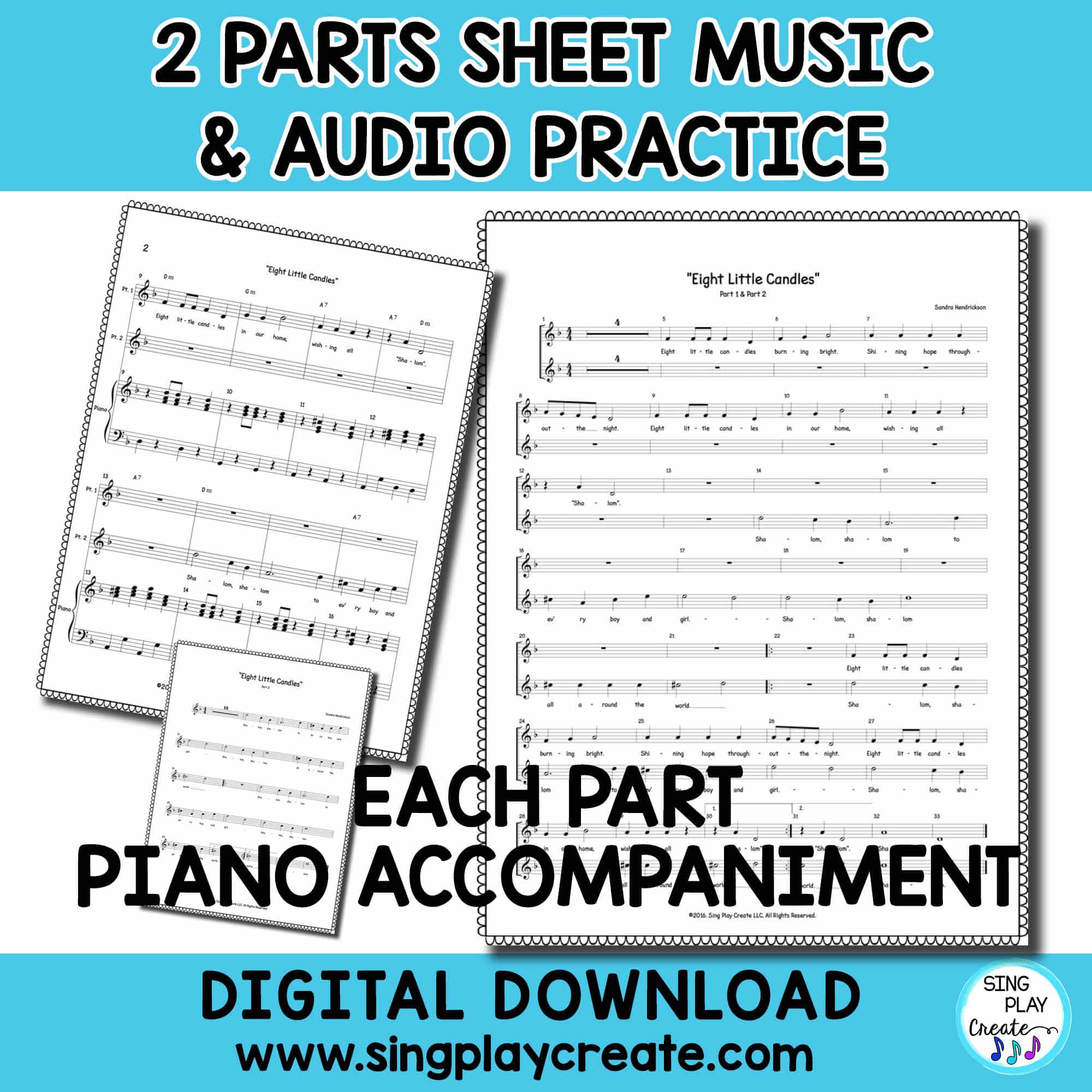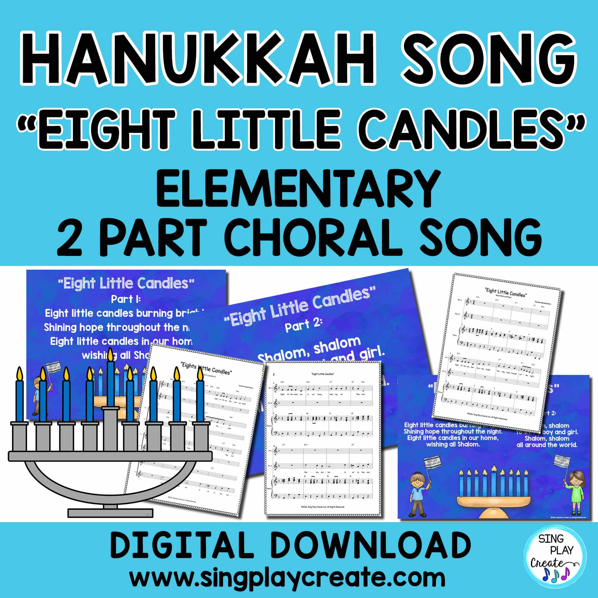 “Eight Little Candles” Hanukkah Theme 2 part choral song is perfect for your upper elementary music classes and choirs. There are practice tracks for each part and 2 piano tracks, one with parts and one with piano only. Teachers will appreciate the presentation with lyrics and the printable lyric sheets. All parts are included in the sheet music file.