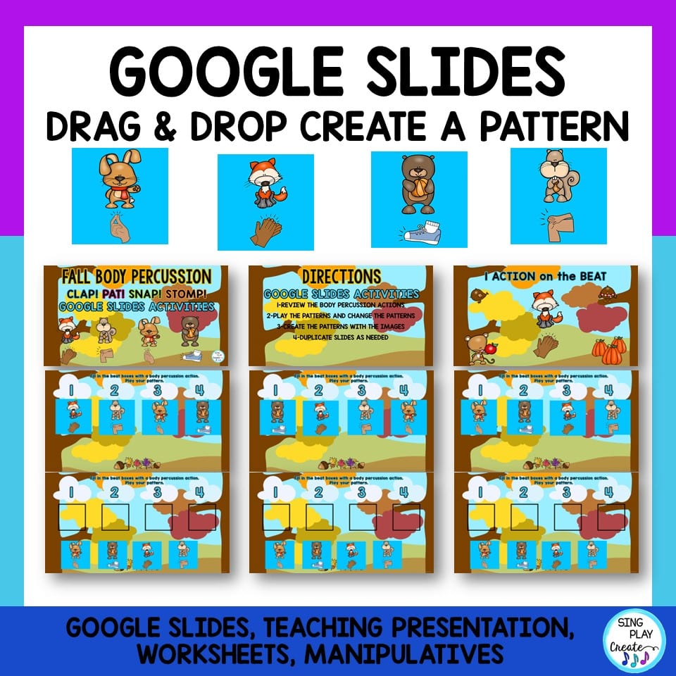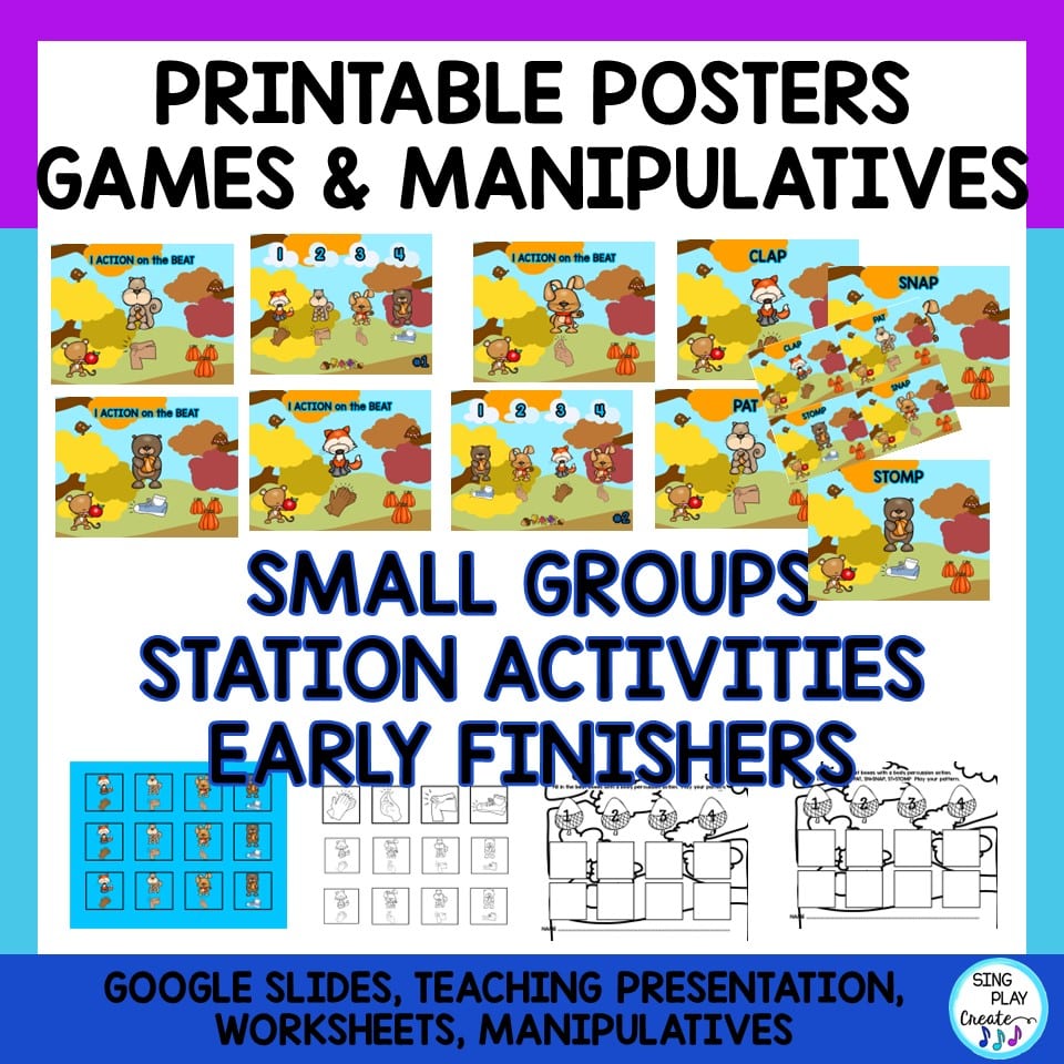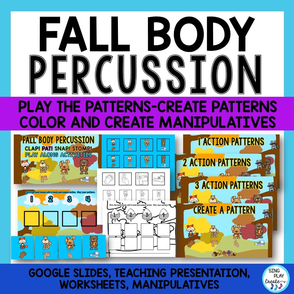 Fall music with body percussion is fun in music class when preschool, kindergarten and first grade students can move to the steady beat. These fall music activities are just right for the fall season in Preschool and Kindergarten. Students will experience moving to the steady beat. CLAP-PAT-SNAP-STOMP with fun forest animals. These music activities are just right for the fall season in Preschool and Kindergarten. Students will experience moving to the steady beat. CLAP-PAT-SNAP-STOMP with fun forest animals.