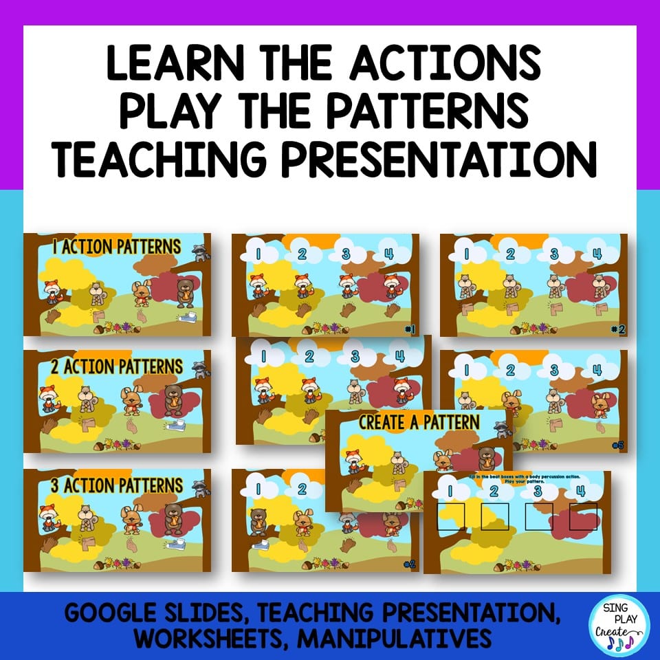 TEACHING MATERIALS- A teaching presentation with slides to show one beat and then the action. Then there are slides with four beats that have 1 action, then 2 actions, then 3 actions and finally a Challenge section.